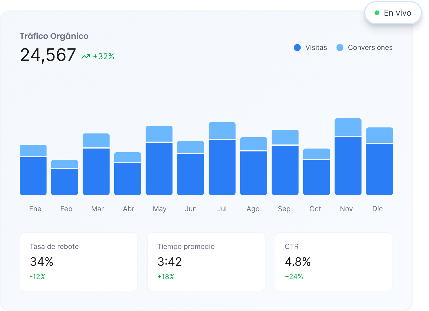 Optimización técnica completa: velocidad, Core Web Vitals, indexación, estructura y rendimiento del sitio.